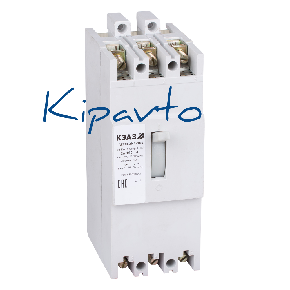 Силовой 3 полюсный автоматический выключатель переменного тока в литом корпусе на номинальный ток 160 А. Выключатели общепромышленного применения АЕ2040, АЕ2050М, АЕ2050М1, АЕ2060М1 КЭАЗ выпускаются в трехполюсном исполнении и предназначены для применения в электрических цепях переменного тока частоты 50, 60 Гц, на напряжения до 400В с рабочими токами до 160 А. Основное назначение выключателей серии АЕ20 - защита кабелей и проводов, а также асинхронных электродвигателей.
