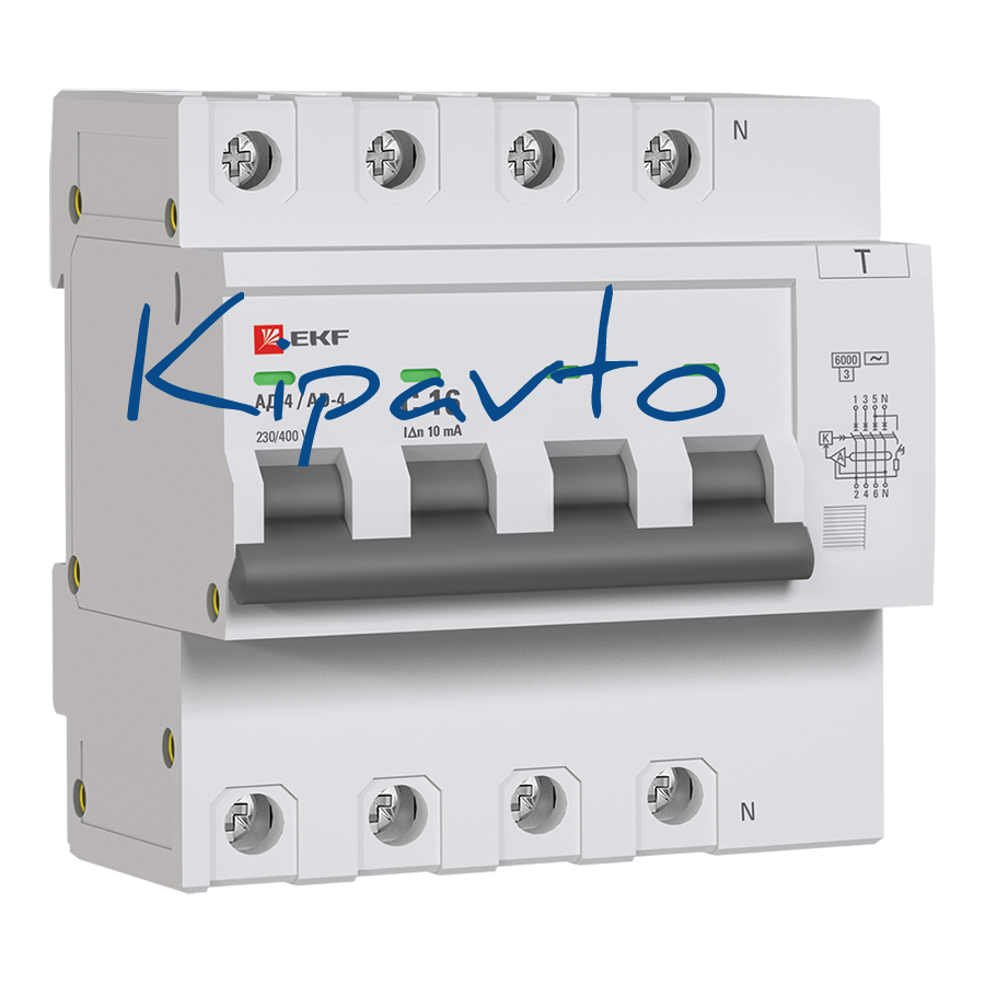 Комплектация: диф. автомат 4Р 16А 10мА тип АС х-ка C эл. 6кА АД-4 EKF