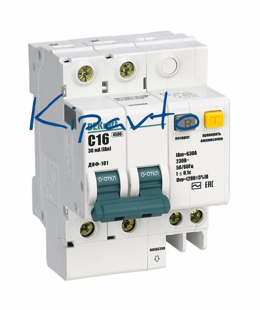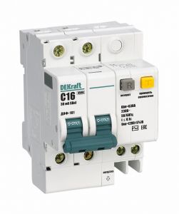 Автоматический выключатель дифференциального тока серии ДИФ-101 DEKraft, 2P, ном.ток 50 А, характеристика C, с защитой от повышения напряжения >280 В, откл.способность Icn 4,5 kA, ток утечки 30 мА, блок дифф.защиты - электронный, ширина - 4 мод. х 18 мм, монтаж - на DIN-рейку. АВДТ применяются в сетях напряжением до 400 В пер.тока для защиты электроустановок от сверхтоков и токов утечки. Для расширения функционала АВДТ возможно использование аксессуаров от выключателей серии ВА-101.