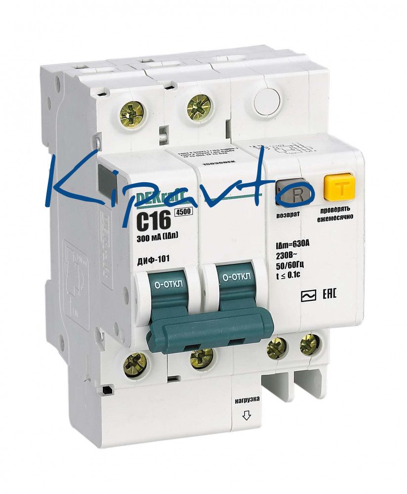 Автоматический выключатель дифференциального тока серии ДИФ-101 DEKraft, 2P, ном.ток 16 А, характеристика C, откл.способность Icn 4,5 kA, ток утечки 300 мА, блок дифф.защиты - электронный, ширина - 3,5 мод. х 18 мм, монтаж - на DIN-рейку. АВДТ серии ДИФ-101 применяются в сетях напряжением до 400 В пер.тока для защиты электроустановок от сверхтоков и токов утечки. Для расширения функционала АВДТ возможно использование аксессуаров от выключателей серии ВА-101.