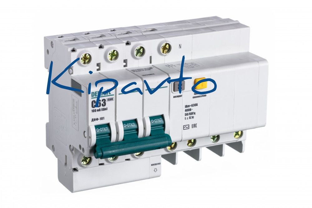 Автоматический выключатель дифференциального тока серии ДИФ-101 DEKraft, 3P+N, ном.ток 63 А, характеристика C, откл.способность Icn 4,5 kA, ток утечки 100 мА, блок дифф.защиты - электронный, ширина - 7 мод. х 18 мм, монтаж - на DIN-рейку. АВДТ применяются в сетях напряжением до 400 В пер.тока для защиты электроустановок от сверхтоков и токов утечки. Для расширения функционала АВДТ возможно использование аксессуаров от выключателей серии ВА-101.
