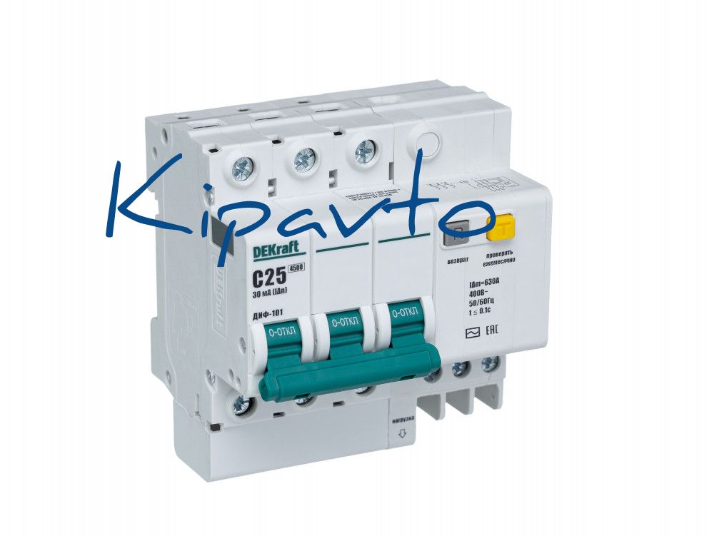 Автоматический выключатель дифференциального тока серии ДИФ-101 DEKraft, 3P, ном.ток 25 А, характеристика C, откл.способность Icn 4,5 kA, ток утечки 30 мА, блок дифф.защиты - электронный, ширина - 5 мод. х 18 мм, монтаж - на DIN-рейку. АВДТ серии ДИФ-101 применяются в сетях напряжением до 400 В пер.тока для защиты электроустановок от сверхтоков и токов утечки. Для расширения функционала АВДТ возможно использование аксессуаров от выключателей серии ВА-101.