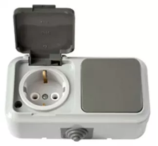 Блок состоит из выключателя одноклавишного и розетки с заземляющим контактом брызгозащищенный открытой установки. Материал корпуса изготовлен из пластика АБС, обеспечивая прочность и долговечность изделия. Степень защиты блока – IP20, что обеспечивает защиту от пыли и посторонних предметов. Возможность горизонтальной и вертикальной установки.