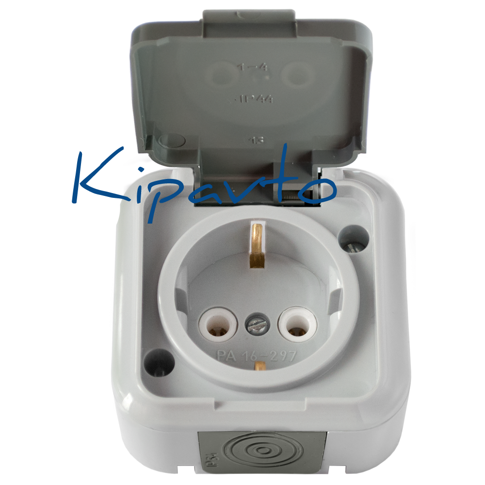 Розетка штепсельная с заземляющим контактом брызгозащищенная открытой установки, предназначена для присоединения электрических приемников с номинальным напряжением 250 В к электрической сети переменного тока. Электротехнические свойства механизма полностью соответствуют номинальным токовым показателям отечественных энергетических линий. Надёжная контактная группа. Изделие выдерживает 20 А. В качестве материала для производства изделия использовался специальный очень прочный и экологически безопасный полимер. Изделие надёжно защищено от разрушительного воздействия ультрафиолетового излучения, не претерпевает видимых изменений при постоянных многочисленных эксплуатационных контактах.