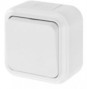 Выключатель одноклавишный брызгозащищенный открытой установки. Выключатель имеет посеребренные контакты. В качестве материала для производства изделия использовался специальный очень прочный и экологически безопасный полимер. Изделие надёжно защищено от разрушительного воздействия ультрафиолетового излучения, не претерпевает видимых изменений при постоянных многочисленных эксплуатационных контактах.