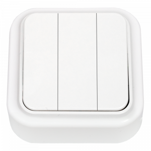 Выключатель трехклавишный открытой установки. Выключатель имеет посеребренные контакты. В качестве материала для производства изделия использовался специальный очень прочный и экологически безопасный полимер. Изделие надёжно защищено от разрушительного воздействия ультрафиолетового излучения, не претерпевает видимых изменений при постоянных многочисленных эксплуатационных контактах.