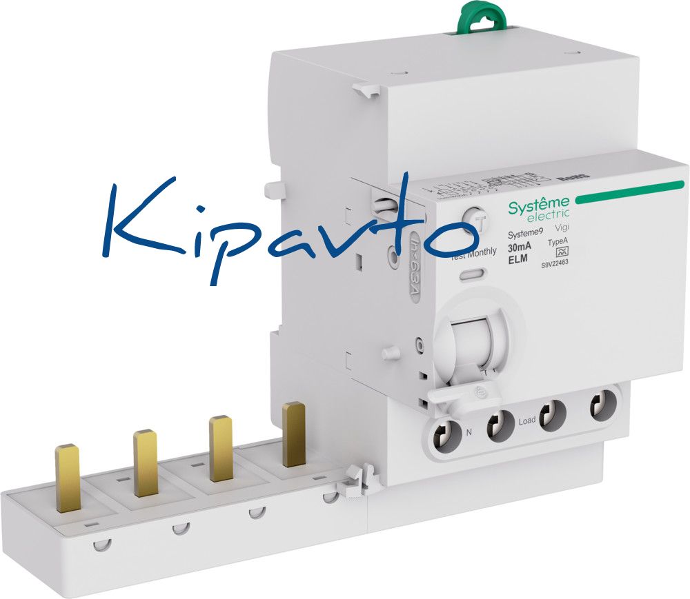 Блок дифференциального тока (БДТ) или Vigi-блок S9V, серии Systeme9, Systeme Electric, 4-полюсный, номинальный ток 63 А, ток утечки - 30 мА, тип A. Соответствует требованиям стандартов ГОСТ IEC 61008-1 и ГОСТ IEC 60947-2. Применяется в электрических сетях напряжением 400 В. В сочетании с автоматическим выключателем предназначен для защиты цепей от сверхтоков и людей от токов утечки при прямом и косвенном прикосновении к токоведущим частям. Принцип действия - электромеханический. Оснащен посадочной шиной для АВ, индикатором срабатывания по причине возникновения тока утечки и защитой от ошибки при выборе АВ. Монтируется на DIN-рейку при помощи двухпозиционных защёлок.
