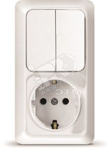 Блок выключатель двуклавишный + розетка с заземлением Олимп вертикальный белый