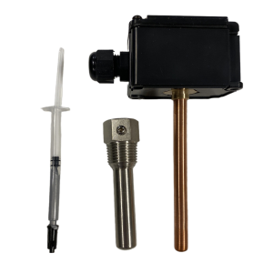 Датчик температуры погружной, диапазон измерения температуры -50…+150°С, выходной сигнал 0…10В, длина погружной части 100 мм, напряжение питания 15…35 В постоянного тока, в комплект поставки входит гильза 50 мм