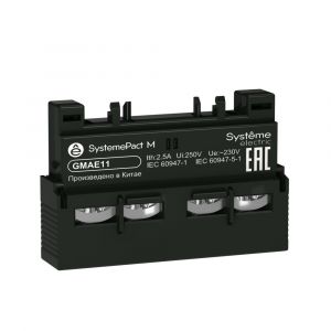 Дополнительный блок контактов для автоматических выключателей серии SystemePact GM2, исполнение - 1НО+1НЗ, монтаж – фронтальный. Блоки дополнительных контактов применяются совместно с автоматическими выключателями и предназначены для увеличения количества вспомогательных контактов, использующихся в цепях сигнализации и управления.