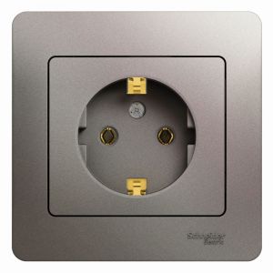Розетка Systeme Electric (ранее Schneider Electric) серии Glossa (в сборе, цвет платина) одинарная c заземлением, без шторок подходит для сетей 250 В, на ток 16 А. Выполнен из материала PС+ASA, стойкого к УФ-излучению и появлению царапин. Эргономичные клеммы розеток расположены в один ряд.