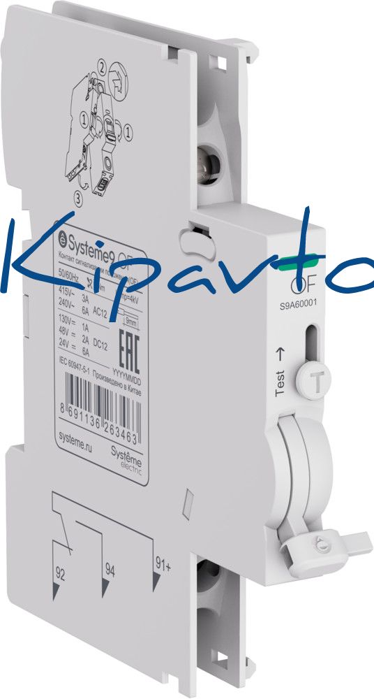 Контакт сигнализации состояния контактной группы устройства (OF) S9. Присоединяется к автоматическим выключателям, автоматическим дифференциальным выключателям, выключателям дифференциального тока, блокам дифференциального тока (монтаж на АВ) и выключателям нагрузки серии Systeme9, для реализации функции сигнализации положения («включено - отключено») этих аппаратов. Они устанавливаются защёлкиванием (без использования инструмента) слева от соответствующего аппарата. Ширина устройства - 9мм. Дополнительные контакты монтируются на устройство после расцепителей, если таковые присутствуют. Максимальное количество дополнительных контактов для одного устройства - 3 штуки, если не установлены расцепители. Если расцепители установлены, то не более 2 штук.
