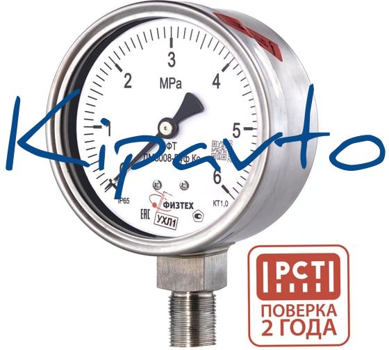 Манометр коррозионностойкий ФИЗТЕХ ДМ8008-ВУф Кс относится к категории контрольно-измерительных приборов для измерения давления. В обозначении и характеристиках указаны диапазон шкалы 0–6 МПа, диаметр 100 мм, класс точности 1,0 и степень защиты IP65. Исполнение обозначено как без заполнения.