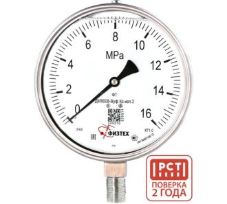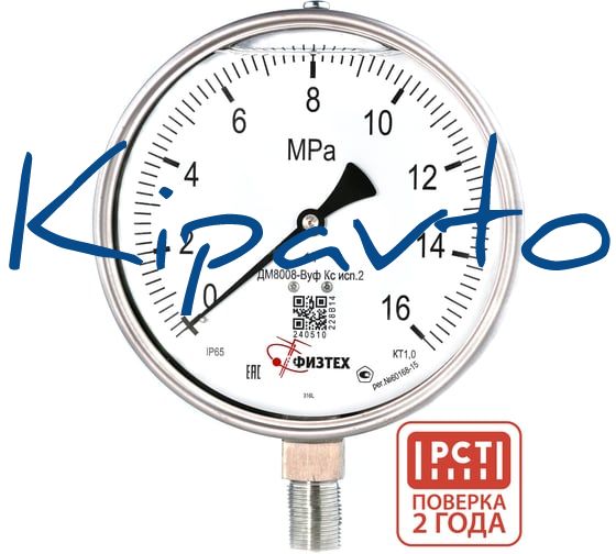 Обозначение в полном наименовании сохраняет заводскую идентификацию исполнения и спецификации прибора. Манометр относится к линейке ФИЗТЕХ и представлен как коррозионностойкое решение с крупным диаметром, радиальным подключением и шкалой до 16 МПа. Основные сведения о модели включают исполнение ДМ8008-ВУф Кс исп 2, защиту IP65, резьбу M20x1.5 и указание на глицерин в составе исполнения.
