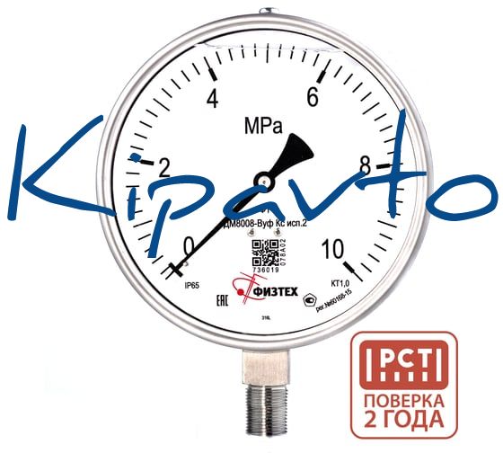Манометр коррозионностойкий Физтех ДМ8008-ВУф Кс исп 2 0-10 МПа кт.1,0 d.160 IP65 M20_1,5 РШ SG, Силикон 4687205724564