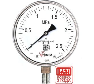 Манометр коррозионностойкий Физтех ДМ8008-ВУф Кс исп 2 0-2,5 МПа кт.1,0 d.160 IP65 M20_1,5 РШ SG Б/запол 4687205724663