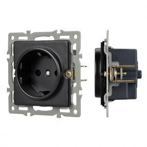 Механизм розетки с заземлением на 1 пост, совместим с рамками имеющими круглый вырез серии GLARE/PRESTO. Скрытый тип монтажа позволяет гармонично встроить в интерьер любого современного дизайн-проекта. Видимая часть механизма выполнена из высококачественного тугоплавкого пластика черного цвета. Контактная часть присоединяется при помощи винтовых зажимов, а усиленные монтажные лапки надежно фиксируют механизм в установочном подрозетнике. Степень защиты IP20 допускает использование устройства во влажных помещениях, с соблюдением требований эксплуатации.