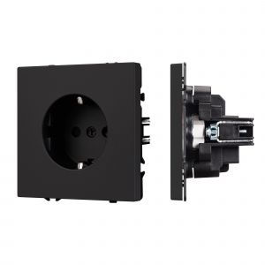 Строгие геометрические линии гармонично сочетаются с функциональностью продуманных механизмов, создавая идеальное решение для дизайн-проектов, где важны как эстетика, так и практичность. Механизм розетки с заземлением совместим с рамками серии NOBE, создает утонченный минималистичный вид. Скрытый тип монтажа позволяет гармонично встроить в интерьер любого современного дизайн-проекта. Видимая часть механизма выполнена из высококачественного пластика черного цвета и имеет Soft-Touch покрытие, что придает изделию приятные тактильные ощущения и стильный внешний вид. Розетка оснащена заземляющими контактами и защитными шторками, обеспечивая надежное и безопасное подключение электроприборов. Суппорт окрашен в черный матовый цвет под основу механизма и выполнен из металла толщиной 1,5мм, что обеспечивает безопасность и уверенность в установке. На каждой стороне суппорта размещены фиксирующие элементы, позволяющие комбинировать механизмы в системы до 5шт как горизонтально, так и вертикально.