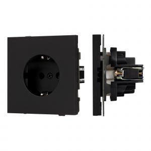 Механизм розетки с заземление совместим с рамками серии TENDO, создает утонченный минималистичный вид. Скрытый тип монтажа позволяет гармонично встроить в интерьер любого современного дизайн-проекта. Видимая часть механизма выполнена из высококачественного пластика черного цвета и имеет покрытие Soft-Touch. Розетка оснащена защитными шторками, которые защищают механизм устройства от повреждений и загрязнений, а также обеспечивают безопасное использование для каждого пользователя. Металлический суппорт окрашен порошковой краской в несколько слоев и выполнен из металла толщиной 1,5мм, что обеспечивает безопасность и уверенность в установке. А усиленные распорные (монтажные) лапки надежно фиксируют механизм в стандартном установочном подрозетнике. На каждой стороне суппорта размещены фиксирующие элементы, позволяющие комбинировать механизмы в системы до 5шт как горизонтально, так и вертикально, под соответствующую рамку.
