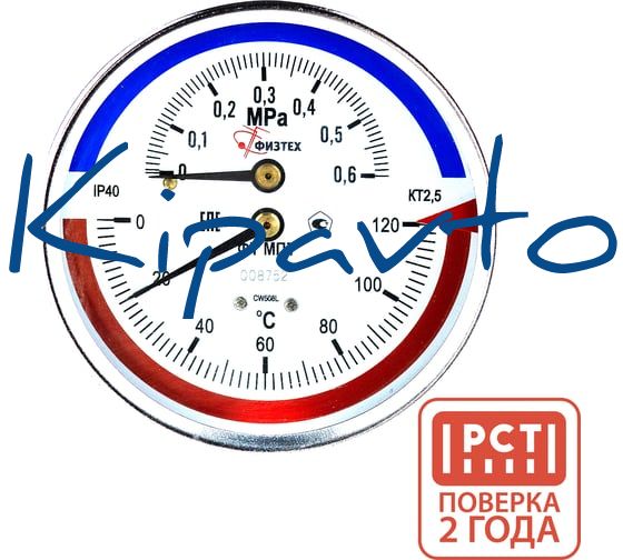 ПО, АО Термоманометр Физтех МПТ 0…120C/0…0,6 МПа кт.2,5 d.100 IP40 G1/2 ОШ L46 4687205630797