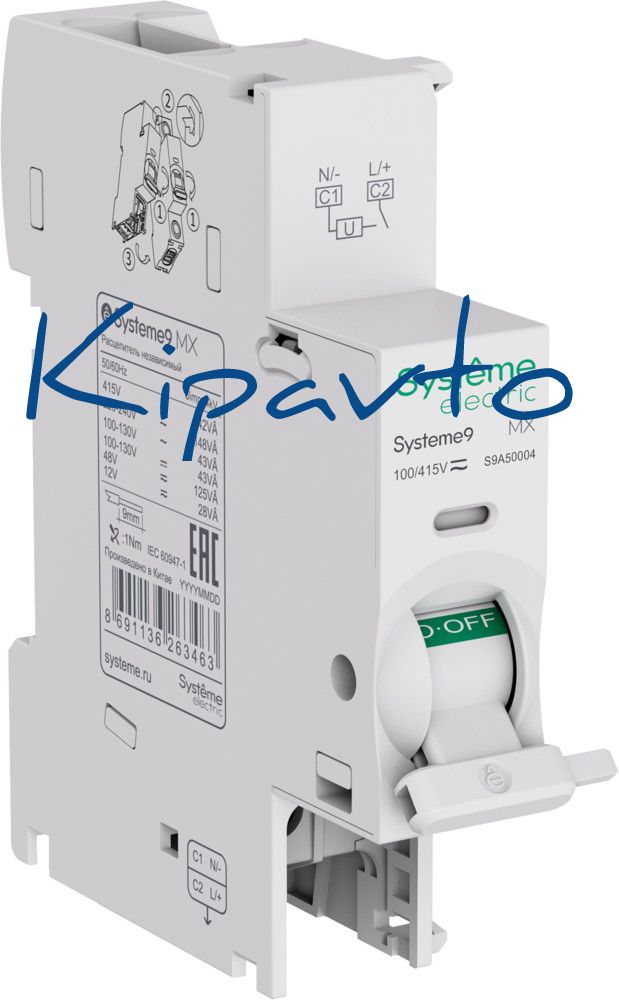 Независимый расцепитель с контактом сигнализации положения «включено - отключено» (MX+OF) S9. При подаче питания на контакты расцепителя, вызывает отключение соответствующего аппарата. Снабжён контактом OF для сигнализации положения «включено» или «отключено». Диапазон напряжений управления: 100 - 415 В AC/DC. Присоединяется к автоматическим выключателям, автоматическим дифференциальным выключателям, выключателям дифференциального тока и блокам дифференциального тока (монтаж на АВ) серии Systeme9, для реализации функции дистанционного отключения и сигнализации. Ширина устройства - 18мм. Устанавливается защёлкиванием (без использования инструмента) слева от соответствующего аппарата. Расцепители монтируются на устройство первыми, дополнительные контакты монтируются после них. Максимальное количество расцепителей для одного устройства - 2 штуки.