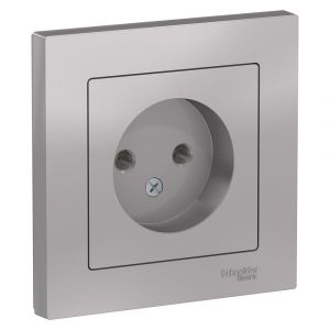 Розетка в сборе Systeme Electric (ранее Schneider Electric) серии AtlasDesign в цвете алюминий одинарная без заземления и без шторок подходит для сетей 250 В, на ток 16 А. Лицевые детали из качественного ABS-пластика, устойчивого к царапинам и УФ-излучению. Изделие поставляется в комплекте с рамкой того же цвета. Усиленные прямые монтажные лапки для лучшей фиксации механизма в монтажной коробке.