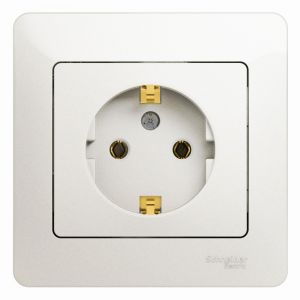 Розетка Systeme Electric (ранее Schneider Electric) серии Glossa (в сборе, цвет перламутр) одинарная с заземлением, без шторок подходит для сетей 250 В, на ток 16 А. Выполнен из материала PС+ASA, стойкого к УФ-излучению и появлению царапин. Эргономичные клеммы розеток расположены в один ряд.
