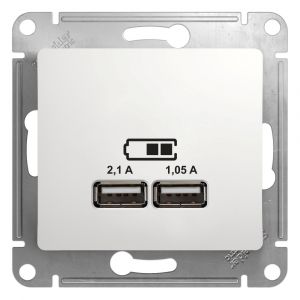 Механизм Systeme Electric (ранее Schneider Electric) серии Glossa (цвет белый) розетки с двумя разъёмами USB с выходными напряжением 5 В постоянного тока и выходами с номинальным током по 2,1 А. Предназначен для зарядки мобильных устройств: телефоны, планшетные компьютеры, mp3/mp4 плееры. Может заряжать одно или два устройства одновременно. Выполнен из материала PС+ASA, стойкого к УФ-излучению и появлению царапин.