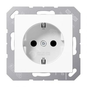 Штепсельная розетка SCHUKO одинарная, с заземлением, с шторками, 16A, 250В (механизм + накладка, без рамки). Серия A500 Материал- дуропласт Цвет- белый