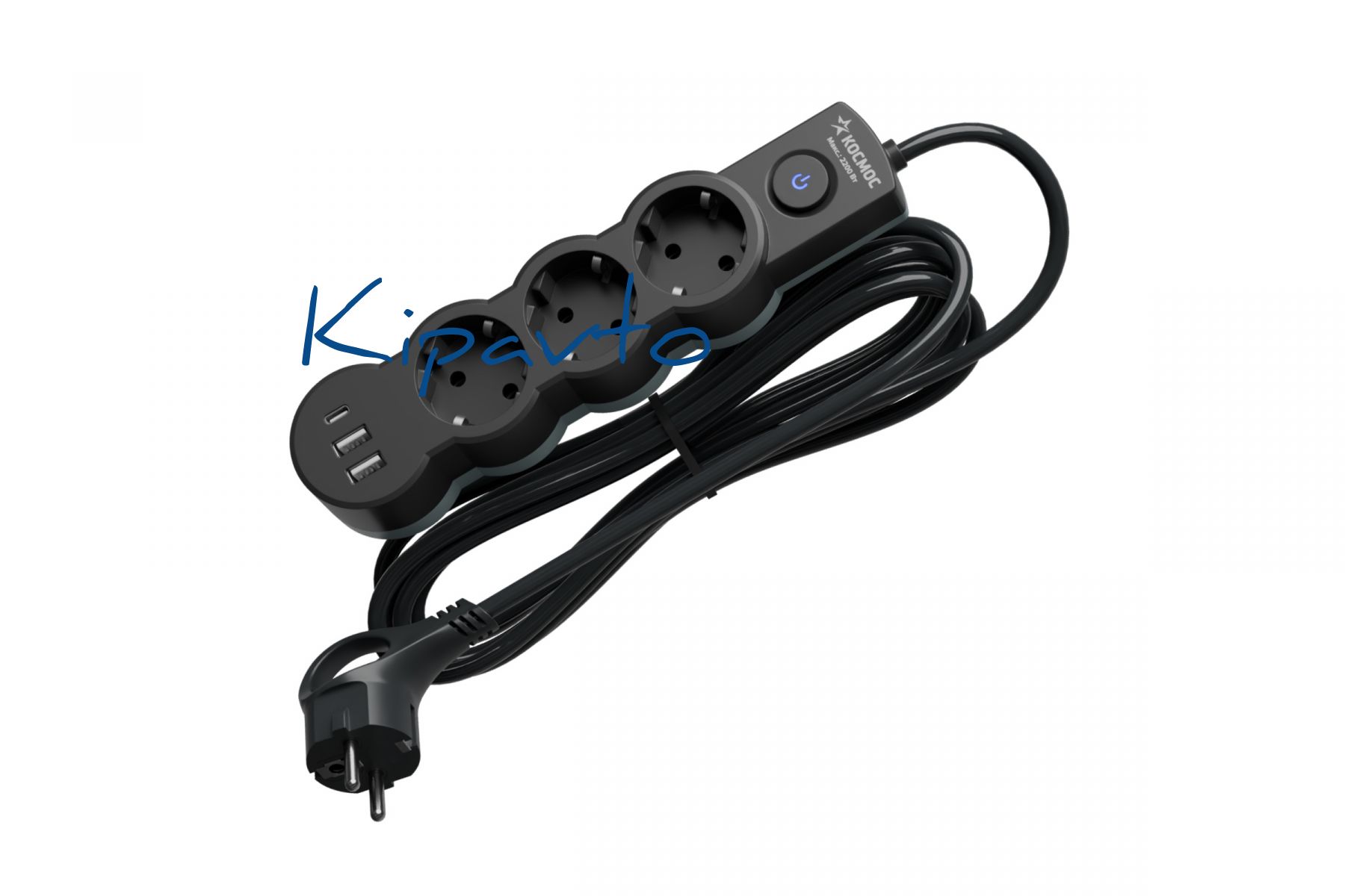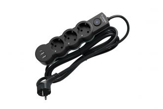 Бытовой удлинитель черного цвета с кнопкой включения и USB для питания и зарядки устройств, корпус выполнен из прочного ABS пластика с 3 гнёздами, 10 А, 5м ПВС провод 3х1 мм2, темп. Эксплуатации от +1 до +35 °C, ном. Частота 50 Гц, напряжение 220В, IP20, макс. Мощность 10А 2500 Вт, предельно допустимая 2800 Вт. Китай.