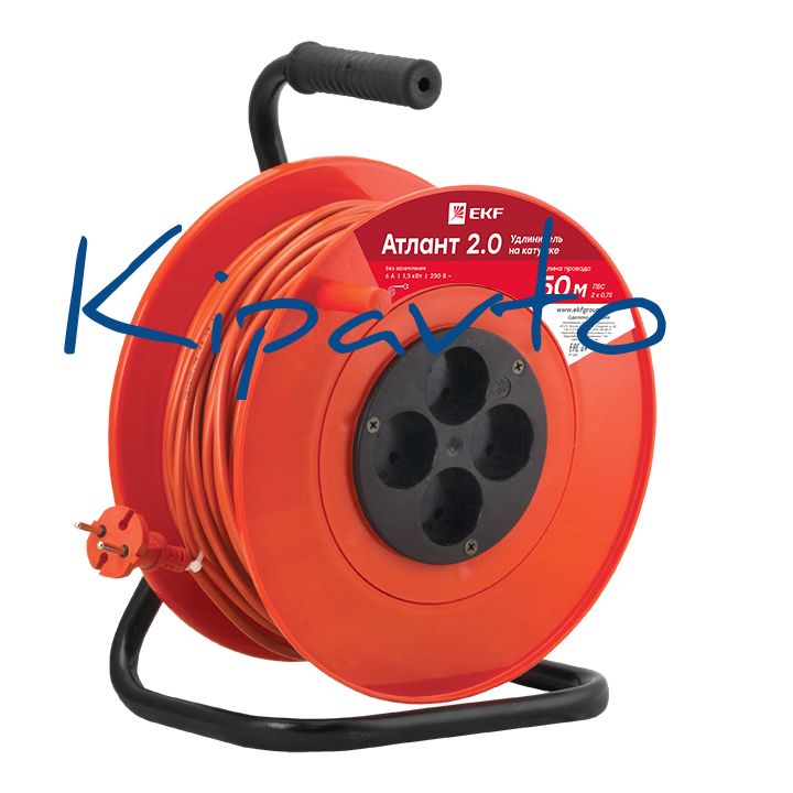 Преимущества: Рама из металлической трубы с резиновой рукояткой|Ударопрочный пластик катушки|Розеточный блок на четыре гнезда|Гибкий надежный проводник ПВС от 30 до 50 метров