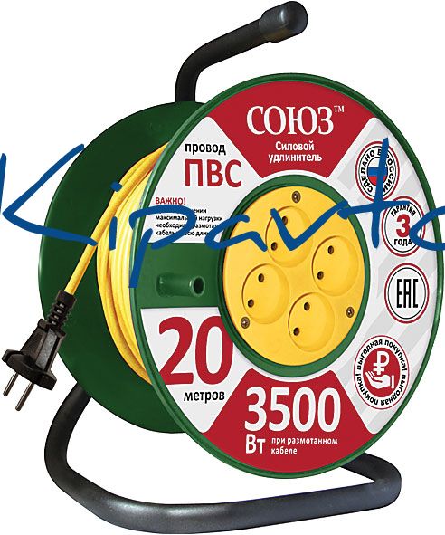 Удлинитель силовой ''СОЮЗ''. Удлинитель имеет 4 гнезда розеток без заземления. Сетевой шнур изготовлен из провода ПВС (2 х 1,5). Стойка из сварной трубы с порошковой окраской. Катушка из ударопрочного пластика толщиной 2,5 мм. Напряжение в сети - 220-250 В, максимальная мощность 3500 Вт. Комплектность - изделие, упаковочный пакет, гофрокороб, паспорт изделия.