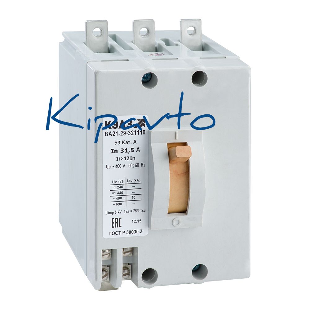 Силовой 3 полюсный автоматический выключатель переменного тока в литом корпусе на номинальный ток 63 А. Выключатели КЭАЗ типа ВА 21 предназначены для проведения тока в нормальном режиме и отключения тока при перегрузках и коротких замыканиях или только при коротких замыканиях, а также для оперативных включений и отключений электрических цепей.