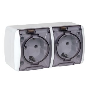 Розетка двухместная EKF серии Владивосток с заземлением, без шторок и с крышкой позволяет организовать электроснабжение в условиях высокой влажности и пыльных помещениях, на улице при условии установки под навесом. Герметичные вводы с двух сторон изделия обеспечивают надежную защиту, позволяя использовать устройство в агрессивных условиях.