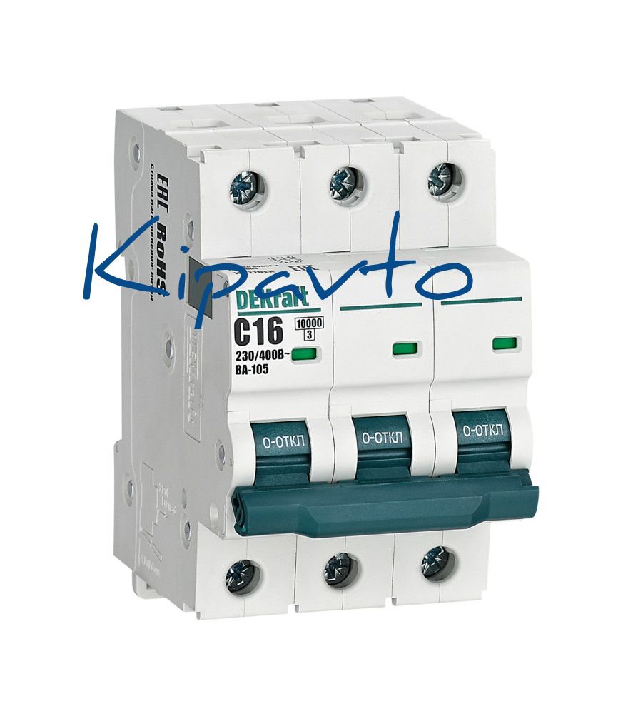 Автоматический выключатель серии ВА-105 DEKraft, 3P, ном. ток 16 А, характеристика C, откл. способность Icn 10 кА, установка - на DIN-рейку, ширина - 3 мод. х 18мм. Преимуществом выключателей ВА-105 является их высокая механическая и электрическая износостойкость — в 20 000 и 10 000 циклов соответственно. Аппараты ВА-105 имеют возможность применения независимых расцепителей на переменный и постоянный ток, а также возможность установки устройств на аппараты гребенчатых шин типа PIN.