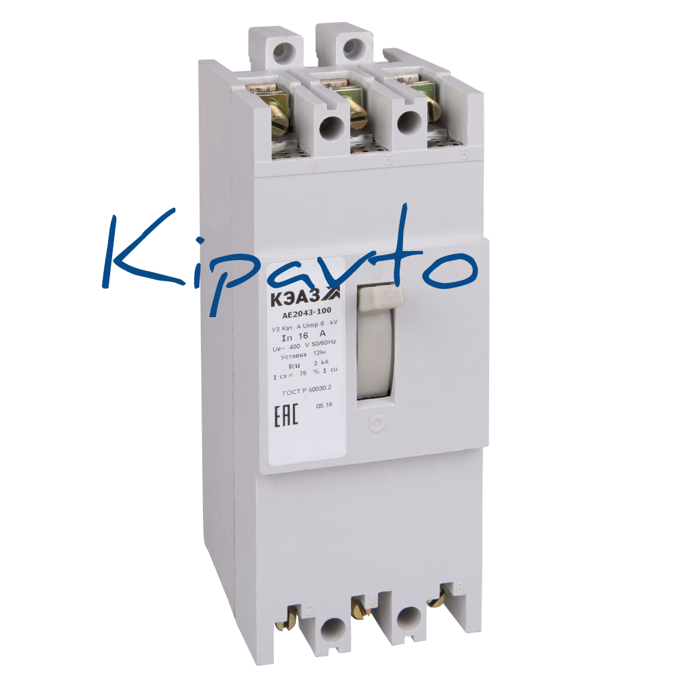 Силовой 3 полюсный автоматический выключатель переменного тока в литом корпусе на номинальный ток 100 А. Выключатели общепромышленного применения АЕ2040, АЕ2050М, АЕ2050М1, АЕ2060М1 КЭАЗ выпускаются в трехполюсном исполнении и предназначены для применения в электрических цепях переменного тока частоты 50, 60 Гц, на напряжения до 400В с рабочими токами до 160 А. Основное назначение выключателей серии АЕ20 - защита кабелей и проводов, а также асинхронных электродвигателей.