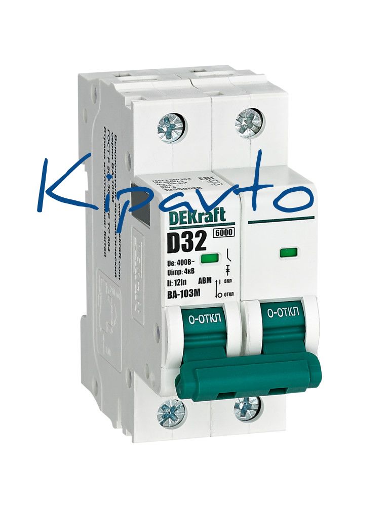 Автоматический выключатель без теплозащиты серии ВА-103M Dekraft, 2P, ном. ток 32 А, ном. раб. напряжение 400 В, кривая отключения D. Автоматические выключатели серии ВА-103М имеют специальное назначение для систем противопожарной защиты и вентиляции и выдерживают ток КЗ до 6000 А. Также они могут использоваться для нечастых оперативных включений и отключений указанных цепей. Автоматические выключатели соответствуют директиве RoHS, имеют расширенный диапазон рабочих температур от -25 до +60 °C, удобны и безопасны в эксплуатации.