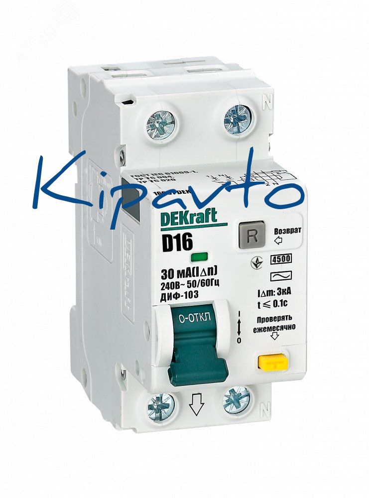 Автоматический выключатель дифференциального тока серии ДИФ-103 DEKraft - 1P плюс N - ном.ток 16 А - характеристика D - откл.способность Icn - 4.5 kA - ток утечки 30 мА, тип - АC - блок дифф.защиты and ndash - электронный - АВДТ применяются в сетях напряжением до 230 В пер.тока для защиты человека от поражения электрическим током и электроустановок от сверхтоков и токов утечки. Аппараты ДИФ-103 являются более компактным вариантом АВДТ по сравнению с серией ДИФ-101.