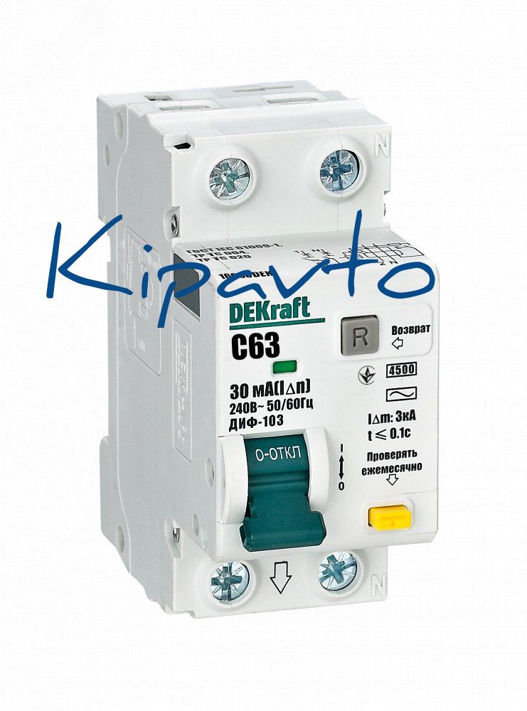 Автоматическими выключателями дифференциального тока серии ДИФ-103 DEKraft - 1N плюс P, номинальный ток 63 А, ном.дифф. ток 30 мА, тип дифференциального расцепителя - AC - кривая отключения - С - на DIN-рейку. АВДТ (автоматическими выключателями дифференциального тока) сочетают функции автоматического выключателя и УЗО (ВДТ), обеспечивают три вида защиты — от короткого замыкания, перегрузки и возникновения утечки тока (в частности, вследствие прикосновения человека к токоведущим частям). АВДТ с отключающей способностью 4,5кА применяются в распределительных, учетно-распределительных, телекоммуникационных щитах и др. в жилищном, гражданском строительстве, сельском хозяйстве, инфраструктуре объектов промышленности.