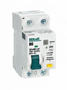 Автоматический выключатель дифференциального тока серии ДИФ-103 DEKraft - 1P плюс N - ном.ток 6 А - характеристика D - откл.способность Icn - 4.5 kA - ток утечки 30 мА, тип - АC - блок дифф.защиты and ndash - электронный - АВДТ применяются в сетях напряжением до 230 В пер.тока для защиты человека от поражения электрическим током и электроустановок от сверхтоков и токов утечки. Аппараты ДИФ-103 являются более компактным вариантом АВДТ по сравнению с серией ДИФ-101.