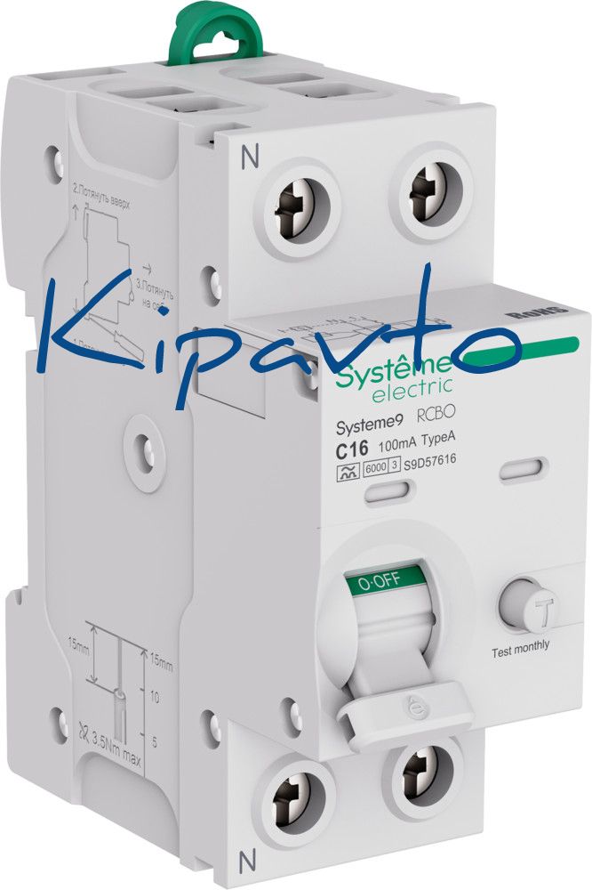 Автоматический выключатель дифференциального тока (АВДТ) S9D, серии Systeme9, Systeme Electric, 1P+N, номинальный ток 16 А, характеристика C, Icn - 6 кА, ток утечки - 100 мА, тип A. Соответствует требованиям стандартов ГОСТ IEC 61009-1 и ГОСТ IEC 60947-2. Применяется в электрических сетях напряжением 230 В. Предназначен для защиты цепей от сверхтоков и для защиты людей от токов утечки при прямом (10 и 30мА) и косвенном (100мА) прикосновении к токоведущим частям, а также для защиты электроустановок от возгорания (300мА). Принцип действия - электромеханический. Нейтраль слева. Оснащен двойными безопасными клеммами раздельного монтажа проводников, механизмом мгновенной коммутации, индикатором состояния контактной группы и раздельными индикаторами срабатывания по причине возникновения сверхтока или тока утечки. Монтируется на DIN-рейку при помощи двухпозиционных защёлок, с возможностью демонтажа без снятия шины PIN.