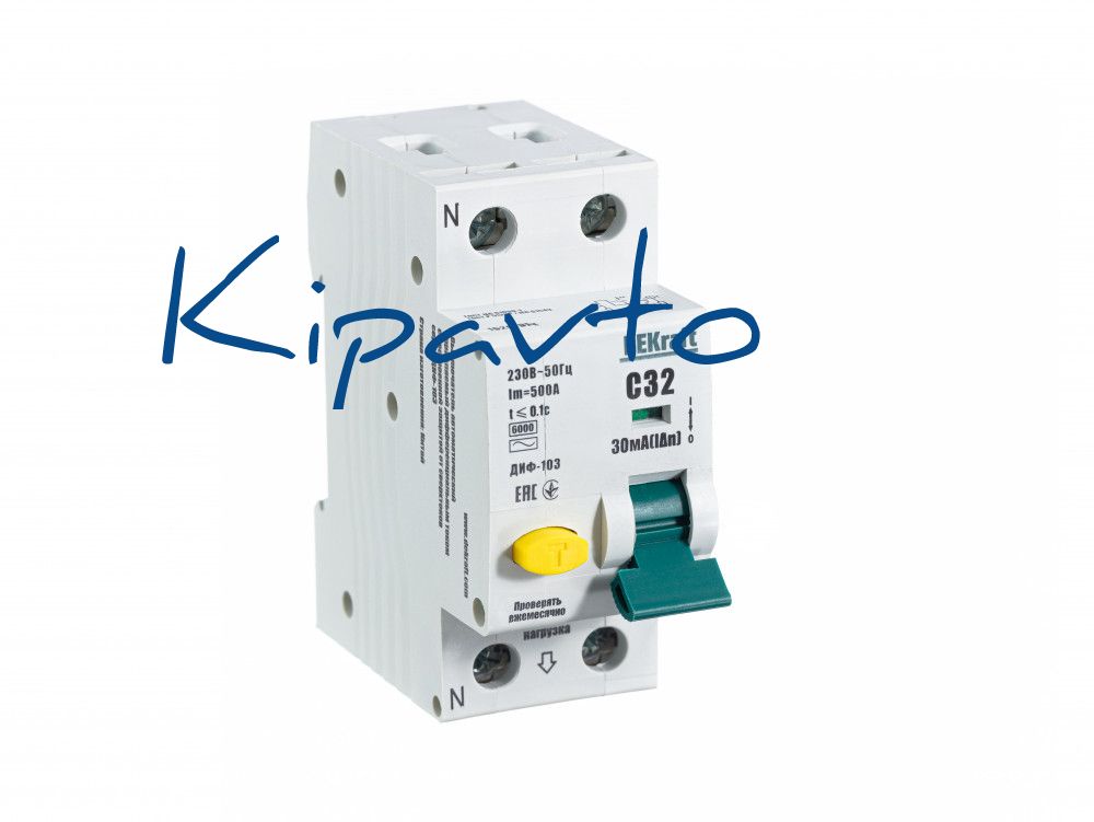 Автоматический выключатель дифференциального тока серии ДИФ-103 DEKraft, 1P+N, ном.ток 32 А, характеристика C, откл.способность Icn 6 kA, ток утечки 30 мА, тип - АС, блок дифф.защиты - электронный, ширина - 2 мод. х 18 мм, монтаж - на DIN-рейку. АВДТ применяются в сетях напряжением до 220 В пер.тока для защиты человека от поражения электрическим током и электроустановок от сверхтоков и токов утечки. Аппараты ДИФ-103 являются более компактным вариантом АВДТ по сравнению с серией ДИФ-101.