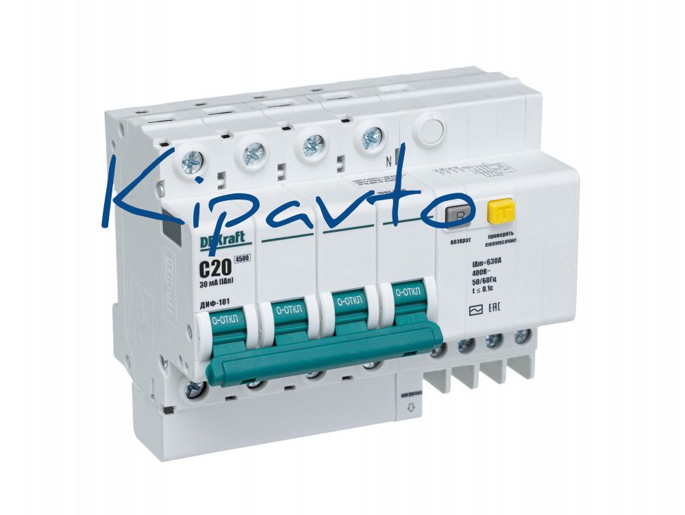Автоматический выключатель дифференциального тока серии ДИФ-101 DEKraft, 4P, ном.ток 20 А, характеристика C, откл.способность Icn 4,5 kA, ток утечки 30 мА, блок дифф.защиты - электронный, ширина - 6,5 мод. х 18 мм, монтаж - на DIN-рейку. АВДТ серии ДИФ-101 применяются в сетях напряжением до 400 В пер.тока для защиты электроустановок от сверхтоков и токов утечки. Для расширения функционала АВДТ возможно использование аксессуаров от выключателей серии ВА-101.