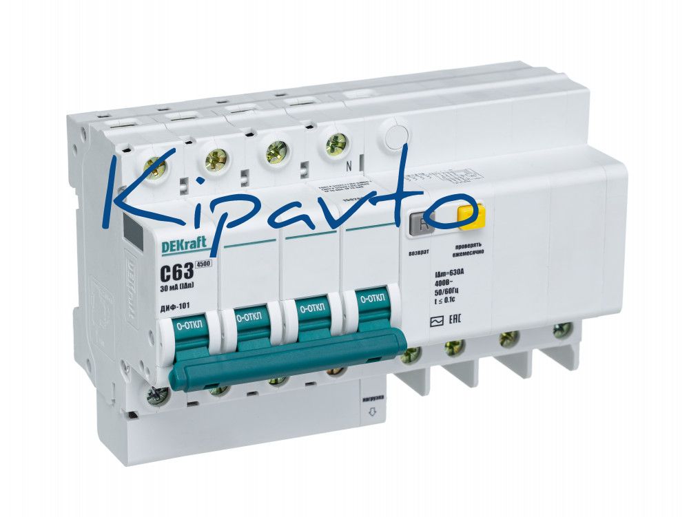Автоматический выключатель дифференциального тока серии ДИФ-101 DEKraft, 4P, ном.ток 63 А, характеристика C, откл.способность Icn 4,5 kA, ток утечки 30 мА, блок дифф.защиты - электронный, ширина - 8 мод. х 18 мм, монтаж - на DIN-рейку. АВДТ серии ДИФ-101 применяются в сетях напряжением до 400 В пер.тока для защиты человека от поражения электрическим током и электроустановок от сверхтоков и токов утечки. Для расширения функционала АВДТ возможно использование аксессуаров от выключателей серии ВА-101.