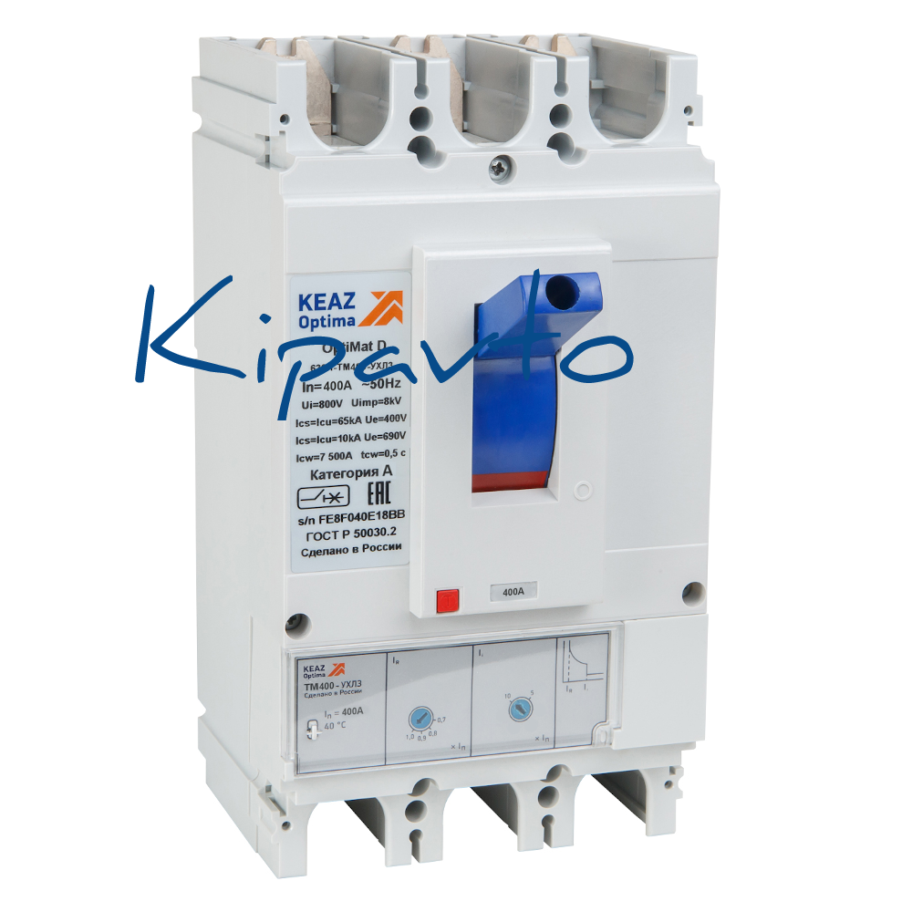 Силовой 3 полюсный автоматический выключатель переменного тока в литом корпусе на номинальный ток 400 А. Автоматические выключатели OptiMat D - новая разработка КЭАЗ для защиты кабелей, оборудования от простого до сложного уровня управления до 1600 А с использованием микропроцессорных и термомагнитных регулируемых расцепителей. Выключатели c микропроцессорными расцепителями нового поколения позволяют измерять и анализировать основные параметры сети. Доступные и функциональные выключатели с термомагнитными регулируемыми расцепителями обеспечивают возможность точной настройки защиты.
