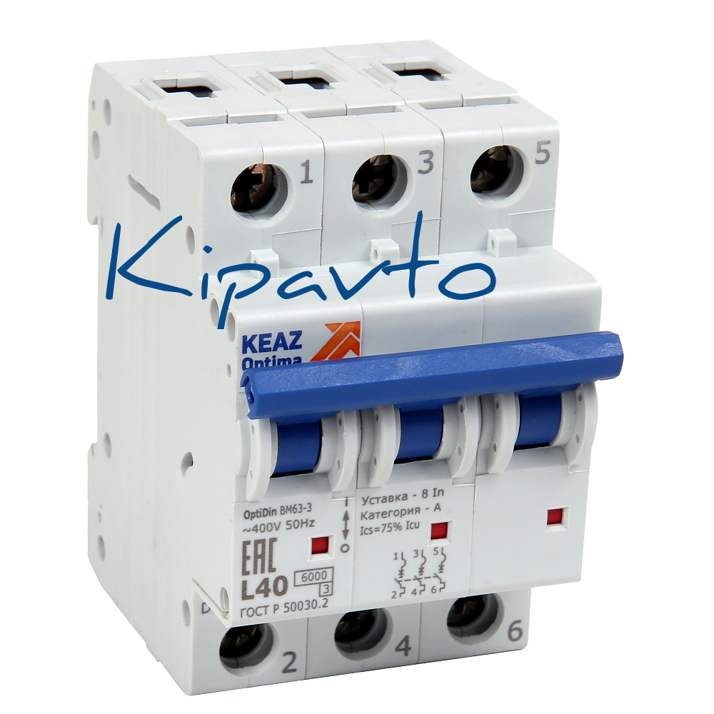 Модульный автоматический 3 полюсный выключатель переменного тока с предельной коммутационной способностью при переменном токе 6 кА на номинальный ток 2 А.