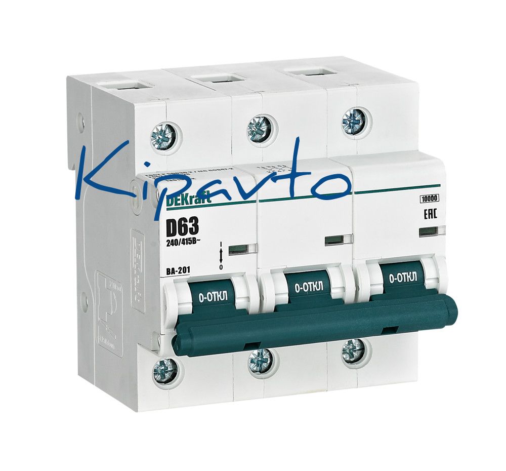 Автоматический выключатель серии ВА-201 DEKraft, 3P, номинальный ток 63 А, характеристика D, отключающая способность 10 кА, ширина - 4,5 мод. х 18мм. Монолитная лицевая панель обеспечивает безопасную эксплуатацию аппарата. Окошко-индикатор всегда показывает состояние аппарата вне зависимости от положения рукоятки управления. Двухпозиционная защелка облегчает монтаж выключателя. Клеммы рассчитаны на подключение проводников сечением до 35 кв.мм.
