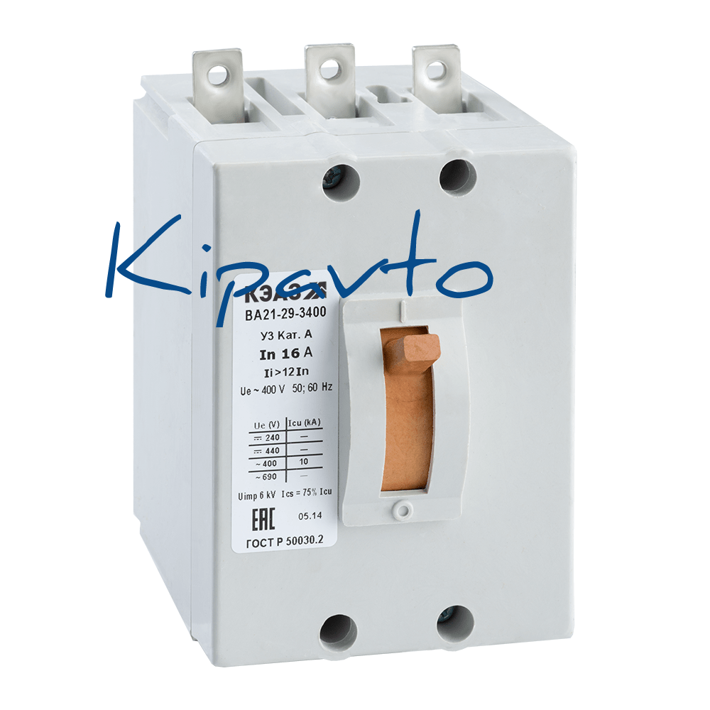 Силовой 3 полюсный автоматический выключатель переменного тока в литом корпусе на номинальный ток 31.5 А. Выключатели КЭАЗ типа ВА 21 предназначены для проведения тока в нормальном режиме и отключения тока при перегрузках и коротких замыканиях или только при коротких замыканиях, а также для оперативных включений и отключений электрических цепей.