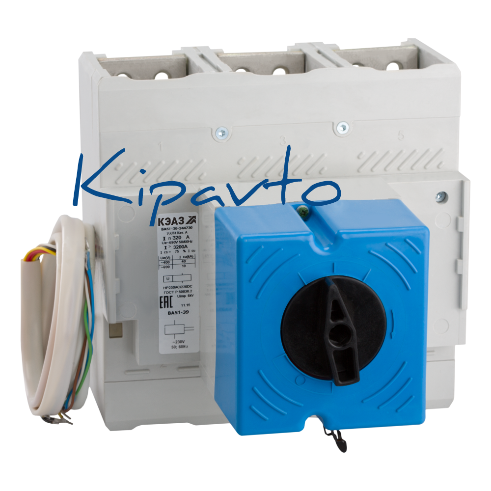 Силовой 3 полюсный автоматический выключатель переменного тока в литом корпусе на номинальный ток 400 А. Трехполюсные автоматические выключатели КЭАЗ типа ВА 51-39 предназначены для применения в электрических цепях с напряжением 400 / 690 В переменного тока частотой 50 и 60 Гц и 440В постоянного тока, их защиты от токов короткого замыкания, токов перегрузки, недопустимых снижений напряжения, а также для нечастых оперативных включений и отключений.