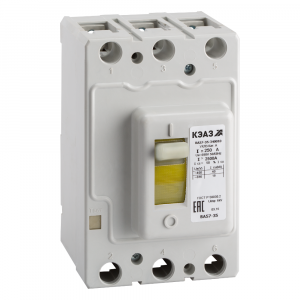 Силовой 3 полюсный автоматический выключатель переменного тока в литом корпусе на номинальный ток 63 А. Трехполюсные автоматические выключатели КЭАЗ серии ВА57-35 предназначены для применения в электрических цепях с напряжением 400 / 690 В переменного тока частотой 50 и 60 Гц и 110 / 220 / 440 В постоянного тока, их защиты от токов короткого замыкания, токов перегрузки, недопустимых снижений напряжения, а также для нечастых оперативных включений и отключений.